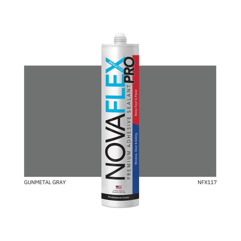 NovaFlex Pro Gunmetal Gray is a high-performance, one-part, non-sag silicone sealant designed for metal roofs, siding, gutters, trim, and other construction applications. This professional-grade sealant provides unbeatable adhesion to metal, coated metals (including Kynar®), wood, masonry, PVC, and more, ensuring a durable, waterproof, and flexible seal.